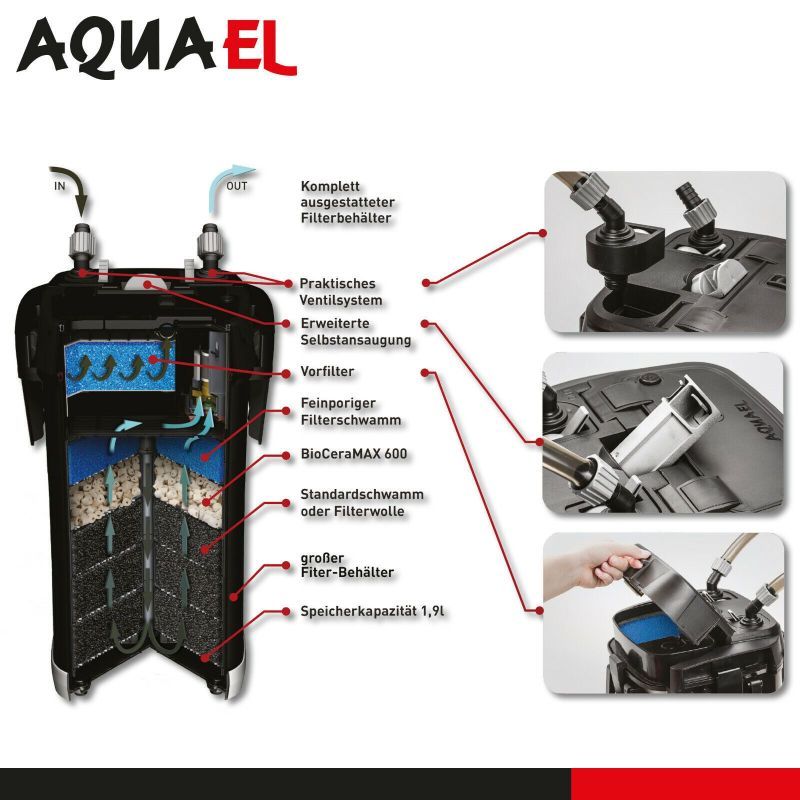 Grâce à l’ingéniosité des techniciens Aquael le filtre est silencieux tout en ayant une consommation dérisoire, de seulement 10 watts. L’amorçage est simplifié grâce à son système de piston. Le kit comprend aussi un ensemble de médias filtrant biologique et mécanique, le filtre est donc prêt à l’emploi. Les filtre utramax sont donc certainement parmi les meilleurs filtres en termes de rapport qualité/prix.
