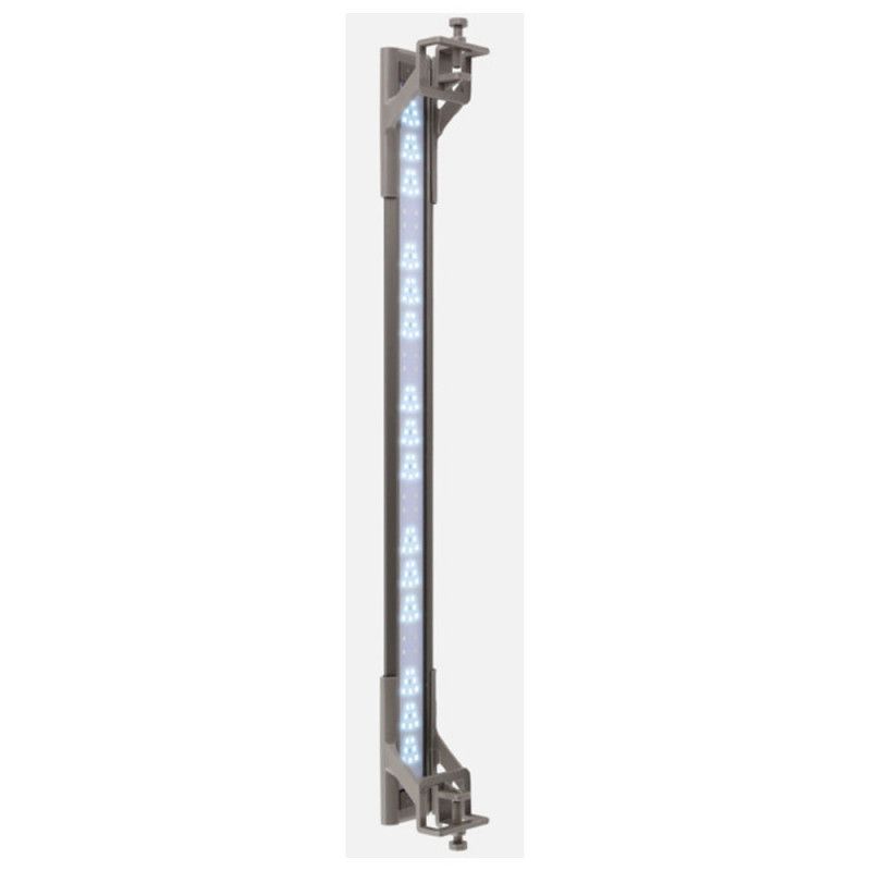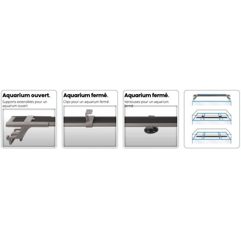 Grâce à ses supports coulissants inclus, la rampe peut être facilement ajustée pour s'adapter à diverses configurations d'aquariums. Elle peut être fixée sur les rebords des aquariums ouverts ou installée dans les aquariums fermés grâce à un ingénieux système de fixation ou des ventouses.